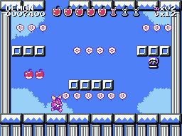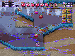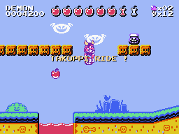 In the most drastic departure from the Mario formula, your demon has a short range claw swipe attack, allowing you to directly attack foes. You can also ride on any disabled enemy, which spins around almost haphazardly. While tough to control, you can use these to double jump onto higher platforms, and can also absorb a single hit from other bad guys. Also at the top of the screen is a “time” meter, similar to Adventure Island, which slowly depletes and can only be refilled by grabbing various bits of fruit.