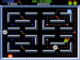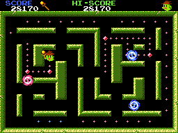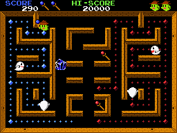 Being one of the most popular video games ever made, Pac-Man inspired a whole bunch of clones, dubbed “dot eating” games in Japan. Nintendo made their own called Devil World, which is largely forgotten, for charitable reasons. Wiz-man is Game Center CX‘s take on this. The object is obviously to collect all of the dots of the screen while avoiding enemies. Also around each level are colored wands. All of the dots are colored either red or blue, and can only be collected when you’re carrying the wand of the corresponding color. The type of wand will also determine which enemies you can kill, which are also colored. Collecting multiple wands of the same color will make you move faster, and also allow you to attack multiple times. Truth be told, this is kind of a boring game. When you give the character a weapon, it completely removes the intensity that Pac-Man had, and switching between wand colors is more tedious than fun. There are 32 floors in total, though, making for a relatively lengthy game.