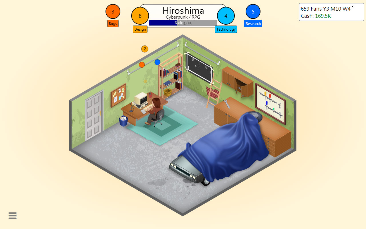 The goal is to make games that sell. You have a series of different topics to choose from, five main genres, and various platforms you can release on. Development has you changing values of focus for different aspects at different phases, such as graphics or dialog, and making these decisions based on your knowledge of the type of game being made in question. Once a game releases, the press decides if its good or bad, and that will directly affect your sales. Along with making games, you also have to research new concepts and technologies to make a wider variety of games, generate game reports to see why a certain game did better or worse than expected, move into new offices, hire new staff to make larger or more polished games, and train staff to better improve their ability to make high quality content.