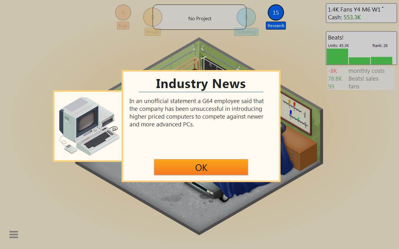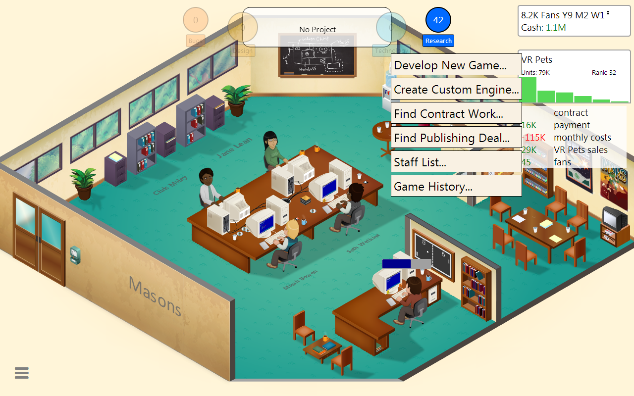 Game Dev Tycoon was made by a small team, and it certainly shows in presentation. There are only a few short music loops during the entire game, while the graphical assists are lacking, to say the least. Character models are in two completely different styles, based on which direction a given character is facing on the screen, while development progress is expressed through little colored bubbles that would look low end for the DOS era. However, it’s difficult to be put off by this. All the menus, where the game is actually played, are easy to navigate and detailed, and the office spaces added some needed flair in the small details, with little posters and figurines spread around as cute references. The starting garage has a Delorean under a tarp, the first office has a little DOOM homage of a posted titled “MARS,” and Super Meat Boy is hanging out in the corporate office (among other heroes). That’s only scratching the surface.