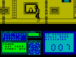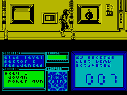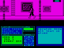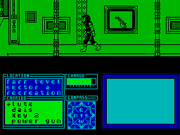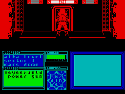The objectives are clearly stated in the manual: locate Marsport's main computer, recover the forcefield plans, and get out alive. However, the complex is huge, featuring many levels linked by elevators. These aren't the kind of elevators that have nice floor select buttons; they drop Marsh off on whatever floor they want, and with ten floors, there's a complex layered approach to mapping. Many of the elevators, similar to the tubes in Wizardry, are one-way, meaning long and elaborate backtracking is mandatory.