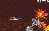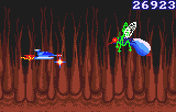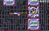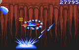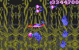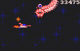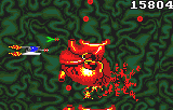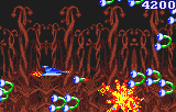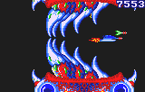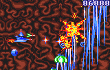 Some universes even incorporate specific tricks, like the way universe “BROT” seamlessly changes backgrounds as well as the color of your ship and HUD as it goes on. The flashiest display the game has to offer takes place in universe “NEAR”, which has the player fly through massive, strikingly detailed alien mouths with moving teeth, culminating in a boss fight against a giant human heart that uses an impressive sprite scaling technique to change its size and emulate a constant heartbeat. Even the act of defeating the most basic enemies is gratifying in the way they leave massive explosions behind, though they’re sometimes large enough to obscure the action.