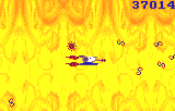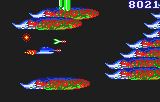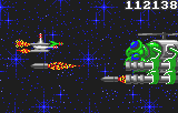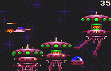 Players can also find four different friendly aliens that will assist them with additional weapons by flying around the player’s ship, much like the options in Gradius. The “Flying Eyeball” flies below you and shoots fireballs, the aptly named “Cosmic Destroyer” chases after enemies and destroys them in short order, “Death Arising” shoots straight up and provides some welcome coverage, and the “Sonic Dart” shoots a large vertical wave ahead. They’re only found in specific universes, so it’s possible to play through the game without encountering them. They can also be destroyed if they’re shot enough times, crash into the environment, or when the player dies, so it’s wise not to get too attached.