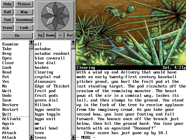 Tragically, what might have been a chilling survival-horror vibe is quickly swept away in favor of more space opera antics. Traversing the ship is a matter of working your way through a couple of simulated planetary environments, or “zoos”, inhabited by various life forms somehow gathered by the Artifact. There is one rather nifty little puzzle involving a Heechee gene manipulation machine, but otherwise this section is hardly distinguishable from the planetary visits of the first game.