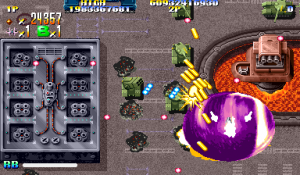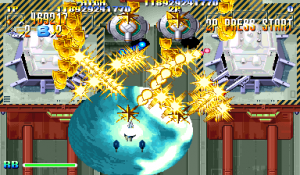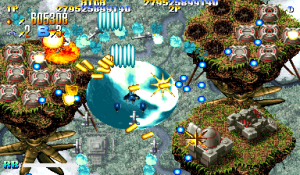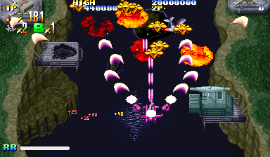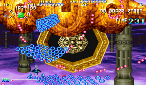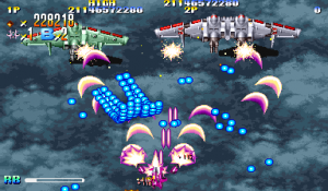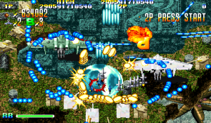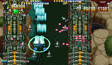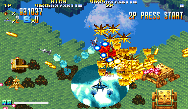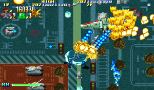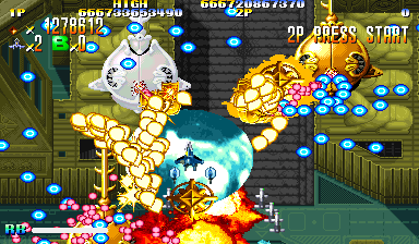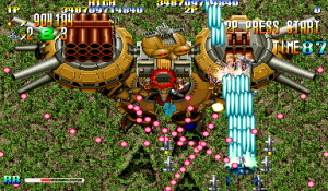 Giga Wing asks and answers the question, what if there was a shooter where you could score a trillion points? The highest score runs a full fifteen digits, and it’s easy enough to score a million points within the first minute of the first stage without even really trying. Each enemy drops a score-multiplying medal, which drastically increases the points obtained from defeated enemies. This multiplier chain increases exponentially as long as you keep obtaining medals, crawling higher and higher as you stay alive. The chain itself resets if you die or complete a stage, though the actual score multiplier remains as long as you don’t run out of lives and continue. The score multiplier itself can go well into the millions, which accounts for the score inflation.