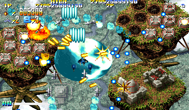 Visually, Giga Wing looks nice and colorful. Most of the stages are typical shoot-em-up territory, though the final stages take place in mystical ruins, owing to the ancient origins of the Medallion. The game uses a 4:3 horizontal monitor rather than the 3:4 of most other vertical shooters, something which affected a few other CPS-2 shooters from this time, perhaps because it made it easier to swap into arcade cabinets. The soundtrack is loud and messy, often drowned out by the sound effects.