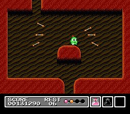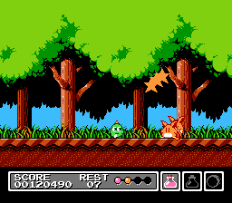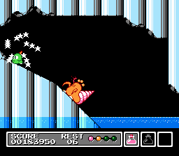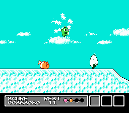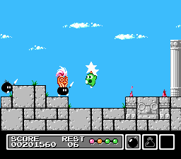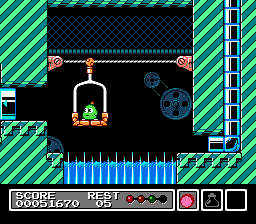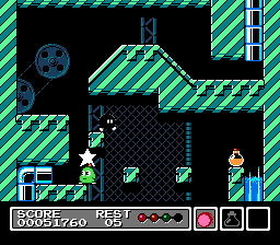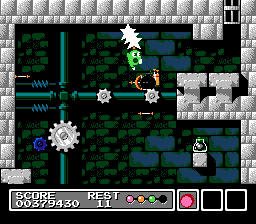 Gimmick! looks like an awful lot like a Kirby game, with its bright colors, loveable bad guys, and even more saccharine main character. However, the Kirby games are, for the most part, fluff. They are not designed so much as tossed together, with levels providing a playground for Kirby to use all kinds of neat powers. Kirby’s Adventure is Nintendo’s last great title on the platform (sorry Wario Woods fans) – but anyone looking for a substantial, challenging experience will end up feeling slightly entertained but ultimately disappointed. Gimmick!, on the other hand, is almost the precise opposite of Kirby’s Adventure – it’s not nearly as expansive, in both its levels or its abilities, but it is meticulously assembled, with each screen possessing unique challenges and situations that requires the player to be mentally invested at all times.