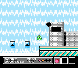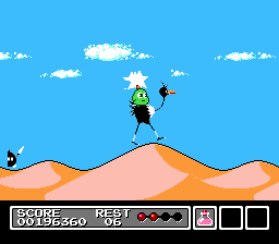 It was, strangely enough, released in very small quantities to Scandinavian countries, where the name was changed to Mr. Gimmick. Like Uforia (Hebereke), it seemed like it was planned to get an international release, and even received a review in Electronic Gaming Monthly, but plans must have fallen through. Realizing the extreme difficulty but perhaps unable to do much to properly fix it, you’re granted nine lives instead of four, which certainly makes the player better equipped to deal with the challenges dealt. Given that European NES systems lack the proper hardware to utilize special sound chips inside of cartridges, the music has been slightly downgraded to fit the specs of a standard NES cart. However, the difference is not extreme – it’s now on the same level as Sunsoft’s other games like Journey to Silius and Gremlins 2, thereby only making it one of the best sounding titles on the NES, rather than the best. The PAL cart will not work properly on NTSC consoles, producing lots of graphical glitches. A prototype of the North American version has been leaked, and is identical to the PAL version, though without the bugs.