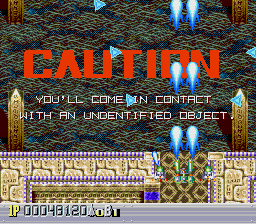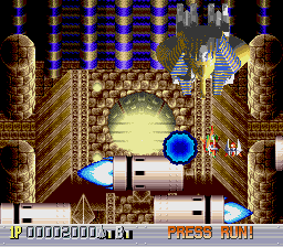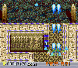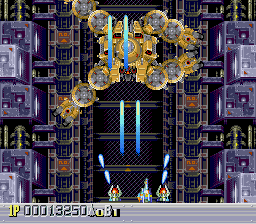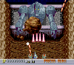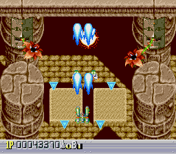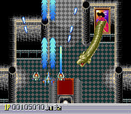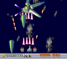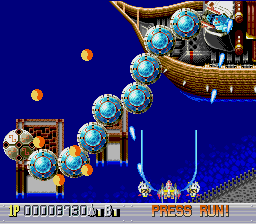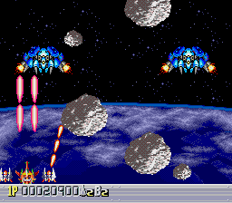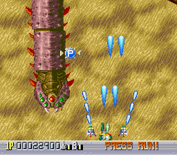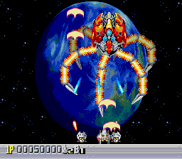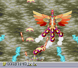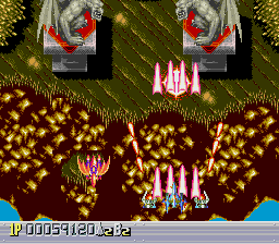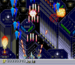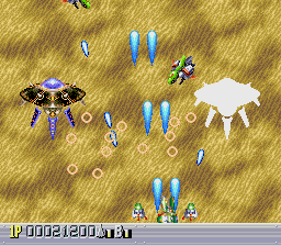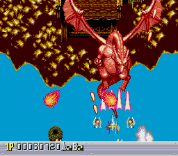 There are five levels, each one taking place during a different time period. The first one takes place in a futuristic Blade Runner-style city, with flames billowing from pyramids and neon signs everywhere. The second is in medieval times, filled with castles, dragons, and enemy space ships disguised as gargoyles. The third takes place in ancient Japan, where you’re assaulted by mythological creatures such as phoenixes and a kirin. The fourth level has an ancient Egyptian theme, where you fight a Sphinx battleship and storm a pyramid. The last level is in space, with the occasional R-Type style monster made of flesh and metal. The stages don’t always scroll straight upwards either, and occasionally have hazardous terrain to avoid, which is somewhat unusual for overhead shooters. Altogether, the game feels rather short – while the time traveling theme allows for diverse landscapes and enemies, there are only three levels that take place in historical settings, so this concept feels underused.