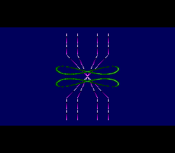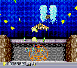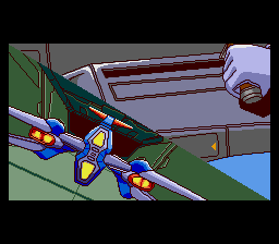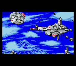 Regardless, Sapphire‘s biggest trick was convincing gamers that the game could render polygonal graphics in real time. This was believable, considering many enemies are made of simplistic, boxy polygonal models, with little or no texture maps, accompanied with extremely smooth animation. This isn’t the case though, as these graphics are prerendered sprites that take advantage of the massive RAM of the Arcade card. (For an effect that uses legitimate polygonal graphics combined with 2D sprites, see Mega Man X2 and X3 for the SNES, which required the use of a math co-processor chip.) There are also tons of other cool graphical flourishes, especially the morphing effects, like the digitized holographic faces on the rooftop of the first stage, or the gargoyle that changes into enemy ships in the second. There are even scaling effects used in a few places. The animation of such frivolous details is often stunning.
