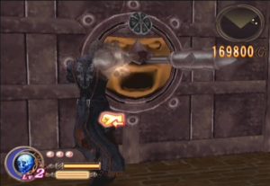 Whenever you pick up any of the power-ups, which include such video game standbys as huge floating fruit, as well as pictures of chicks in bikinis, Gene proclaims “AWESOME!” or “I LOVE IT!” There’s this one fat enemy guy who taunts “What a pain in the bee-hind!”, in a polite manner befitting an English lord. There’s even a Mike Tyson reference as enemies scream “You’re not Alexander!”, alluding to the infamous rant where Tyson taunted Lennox Lewis for not being as strong as Alexander the Great (and threatening to eat his children to boot.) The only downfall to the voice acting is the sparse number of enemy voices. It seems Clover had one guy read off a script of dialog, and merely modified the tone to make his/her voice sound deeper/lighter. This leads to many occasions where you’ll hear the same taunt repeated over and over. At least it has some of the most hilarious death screams ever heard in a video game.