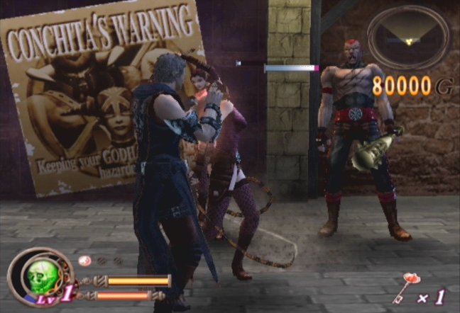 While Gene was traveling the world, he came across Bruce and Felix terrorizing Olivia. Gene, being as cocky as he is, tried to take on the demonic duo but found himself missing one arm. With the God Hand now filling in the stub, Gene has found himself being chased once more by Bruce, Felix, and their leader Conchita. You’ll come across these fools two times during your adventure during God Hand, and with the proper skill you’ll find them added to your beatdown count.