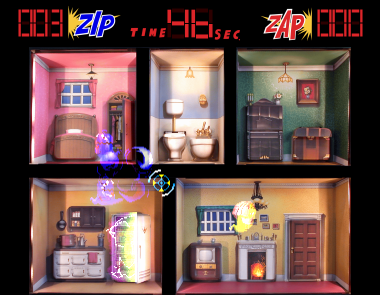 Golly! Ghost! is a lightgun redemption arcade game developed by Namco, a company that is no stranger to games that star ghosts. It takes place entirely within a house, seemingly populated with no humans. However, this house is not technically rendered on the screen. Rather, it’s an electric diorama with tiny mechanical doors that open and close. The in-game graphics of the titular ghosts are then laid over the diorama, and come out of the electrical doors. The score and timer are also in a separate LCD display. There are four types of regular ghosts: (from slowest to fastest in movement speed) blue, yellow, green, and red. A fifth ghost will appear which nets more points than a regular ghost, usually taking the form of an everyday object such as a hamburger or a football. Players have to use the guns mounted to the arcade cabinet to shoot as many ghosts as they can before the time runs out. If the player is able to survive long enough, a boss ghost will appear. If this boss ghost is shot enough times, it will split into several smaller ghosts that can also be shot. Once the timer runs out, the players score is added up, and they can move on to the next stage if they have racked up enough points from shooting ghosts.