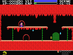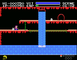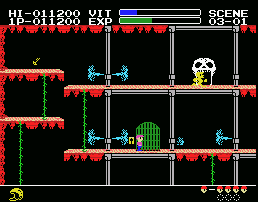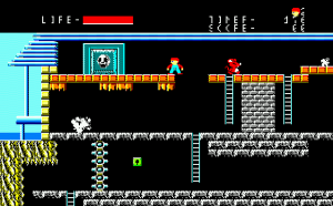 The MSX entry of The Goonies borrows the basic concept from the Famicom version, although it features completely different levels and a number of other changes. You still need to explore levels, but the stages themselves are significantly longer and more complicated, as you need to rescue seven Goonies per stage instead of just one. There are still plenty of hidden items to find, but you never get any additional weapons, so you’re stuck with the crappy kung fu kick for the entire game. You also need to use keys instead of bombs to open doors, and you can only carry one key at a time. There’s also an experience meter that increases every time you kill an enemy. Filling this will grant a minor health restoration. It may not seem like much at first, but this game is tough, and you need all of the health you can get – nigh-invincible Fratelli brothers are just as much of a pain as they are in the Famicom version (they’ll even follow you from screen to screen), and the bouncing skulls are just as annoying. You only get one life, although thankfully there’s a password system so you can skip ahead to later levels. The graphics aren’t quite as good as the NES game, and the locales aren’t as varied either, with most levels simply being palette swapped variations of the same cave tileset. Although the player sprite is exactly the same as the other games, leading you to believe that you play as Mikey, the English language manual seems to think you’re playing as Sloth.