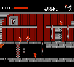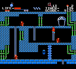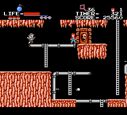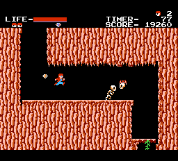 The Famicom version of The Goonies is a bit more in-depth than your average platformer. You play as Mikey as you go through six stages to rescue all of your kidnapped friends. Each level requires you to find three keys and rescue one Goonie before you can go to the next stage. The first level is the restaurant, the last is the pirate ship, and every level in between takes place underground. Although the first stage is only a few screens long, later levels get a bit more complicated, with skeleton doorways that warp Mikey from place to place.
