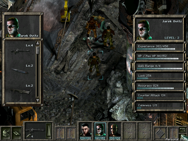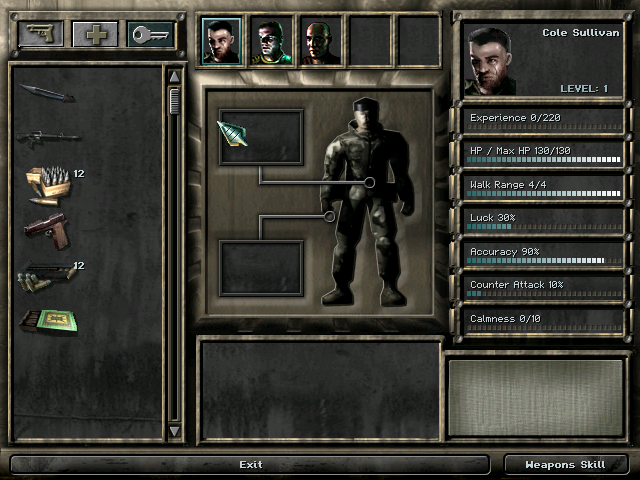 The RPG aspect is somewhat underdeveloped, although this is not a bad thing – the focus on terrain and ammo scarcity works very well for a horror game, and you wouldn’t want characters to become overpowered. Each successful blow will give the character XP, and level ups will give you a chance to spend 5 points across several areas: health, % of chance of missing your shot, % of chance of counter-attacking after being hit (with the same weapon you had in your hand – even if it needs to reload), % of chance to trigger a lucky shot for extra damage, and calmness (affects whether or not your character becomes enraged in battle, i.e. more damage but more chances to miss). Another aspect is that each character starts at level 1 with each weapon, but using it more can level up their use of the weapon up to level 10 – thus, being too conservative of ammo means your character doesn’t get a chance to train up and cause more damage for when enemies get tougher. There isn’t much more (no tech tree or ability to move more spaces, which would be very useful), but it’s a decent enough system that you can explore a few play styles – although strategy and finding the best way to use the weapons effectively across the whole team are paramount.