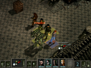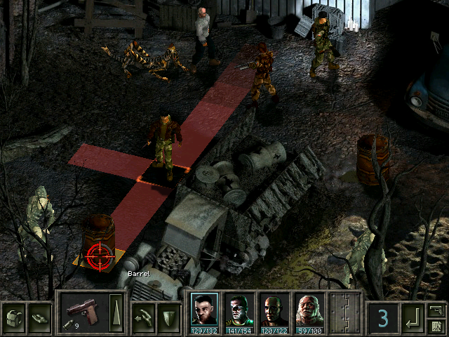 Your progression in the game is shown in an isometric “overworld”, with your 3D characters walking among pre-rendered backgrounds; combats begin at fixed points, i.e. an action or reaching a certain spot will trigger a fight. This isn’t “walk around the overworld and randomly trigger a battle with random enemies”: every single combat situation occurs in a different (pre-rendered) scene with specific terrain, and was scripted/hand-crafted by the designers. This is actually one of Gorky 17‘s greatest strength: the design of these battles is very varied, and each of them tells a different story or exhibits a different challenge. It can be the introduction of a different enemy, or a boss fight (about half a dozen ones, each with different characteristics); or the battle starts with your team swarmed by enemies, or with enemies appearing in waves; the terrain can be wide open and expose you to long-range attacks, or have lots of obstacles preventing you from shooting effectively; maybe some of these obstacles are barrels of gasoline that will explode if shot, or maybe your team starts the battle soaked in gasoline; maybe you need to protect someone, or even something; maybe the game will pull the rug after the second turn and the situation will end up being much worse. As a result, a number of these battles end up being quite memorable! But although scripting every single battle and trigger point in the game leads to a rich and varied game, it also means the game is quite short (around 12 hours of play time – no farming monsters here). There aren’t different levels of difficulty, and just a few optional boss battles, meaning the game may not be very replayable.