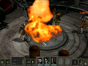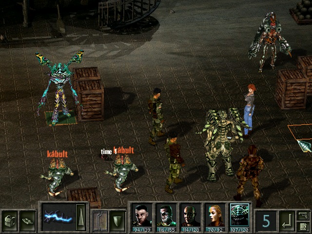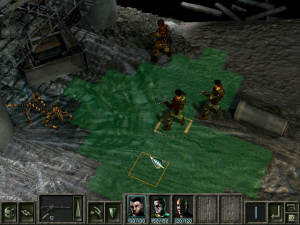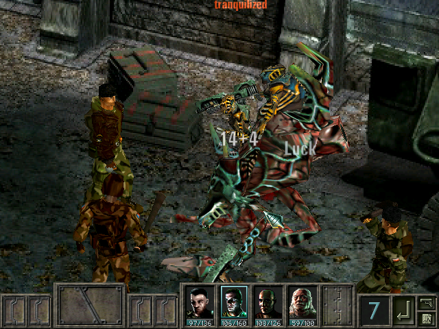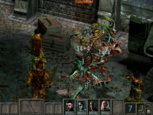 The game is set at night and as such has a lot of blacks, whites, and greys; the atmosphere is suitably spooky, aided by the great sound design. The various interface noises are all crisp and suitably metallic, while the background music lingers on, full of echo and electronic noises, as you explore the ravaged city. The creepy atmosphere is replaced by more urgent, driven tracks during battle, with scarier tracks on the monsters’ turn; overall, you can hear moody Depeche Mode influences in this electronic soundtrack that is appropriately dark. The pre-rendered backgrounds your (3D) crew explores are varied and very nicely designed, with some good details and level design that uses narrow passageways and staircases very effectively to raise tension. The other highlight is the design of the monsters, which mix a great variety of influences; you will see chainsaws and claws, humanoids and insects and Geiger-y beasts, experiments gone clearly wrong, guns and missile launchers and fire, and some of the monsters’ attacks are appropriately horrifying. All in all, despite the game maxing out at 640×480 and the 3D models showing their age and polygons, the nice pre-rendered backgrounds and overall great artistic direction create a great atmosphere that still stands despite technical limitations.