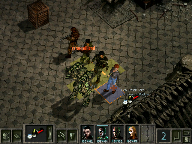 The combat system is what you expect for a tactical RPG, and has draw comparisons with XCOM. It is turn-based, grid-based, one action per turn (plus moving), with the environment’s obstacles allowing you to strategize and play hide and seek with the monsters. The battle is lost once one character from your squad gets killed. Your crew can move 4 spots per turn, and use a variety of weapons that you collect in chests along the way. The 28 weapons display a lot of variety, in their range/the zone they affect (melee, long range in 4 or 8 directions, medium range, and various other shapes), the need to reload, the availability of the ammo, and their effect (poison, fire, tranquilizer, etc.). You will also find some health items, although you can only use them on yourself or someone on a neighboring cell; the healing they provide (while eating up your whole turn) is often not much larger than the next monster’s attack, limiting their use in the battlefield to desperate cases.