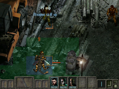 Your progression in the game is shown in an isometric “overworld”, with your 3D characters walking among pre-rendered backgrounds; combats begin at fixed points, i.e. an action or reaching a certain spot will trigger a fight. This isn’t “walk around the overworld and randomly trigger a battle with random enemies”: every single combat situation occurs in a different (pre-rendered) scene with specific terrain, and was scripted/hand-crafted by the designers. This is actually one of Gorky 17‘s greatest strength: the design of these battles is very varied, and each of them tells a different story or exhibits a different challenge. It can be the introduction of a different enemy, or a boss fight (about half a dozen ones, each with different characteristics); or the battle starts with your team swarmed by enemies, or with enemies appearing in waves; the terrain can be wide open and expose you to long-range attacks, or have lots of obstacles preventing you from shooting effectively; maybe some of these obstacles are barrels of gasoline that will explode if shot, or maybe your team starts the battle soaked in gasoline; maybe you need to protect someone, or even something; maybe the game will pull the rug after the second turn and the situation will end up being much worse. As a result, a number of these battles end up being quite memorable! But although scripting every single battle and trigger point in the game leads to a rich and varied game, it also means the game is quite short (around 12 hours of play time – no farming monsters here). There aren’t different levels of difficulty, and just a few optional boss battles, meaning the game may not be very replayable.