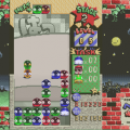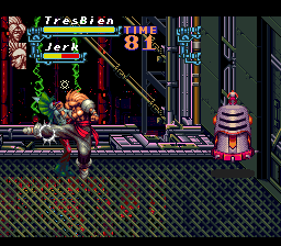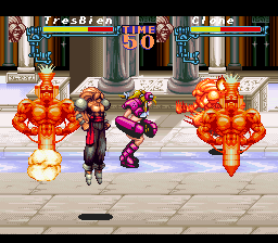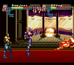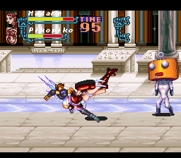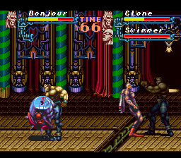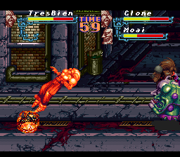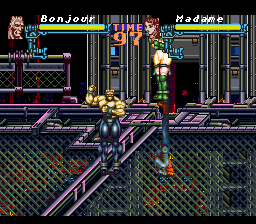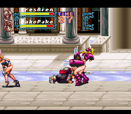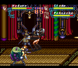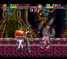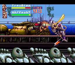 Gurume Sentai Barayarou is a typical side-scrolling beat-’em-up where you fight a succession of various enemies. Like most beat-em-ups of the day of the 16-bit era, your move set is pretty small – a four-punch combo, a jump kick, a pair of throws and two short-range explosive attacks. They don’t do much damage (nor do they drain any of your health) but they can be used as fend off floods of attackers. When beating up enemies, sometimes they get stuck into the ground head first, with their bodies sticking straight up, allowing you to pummel them a few extra times.