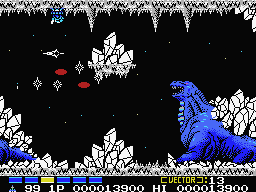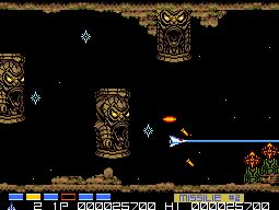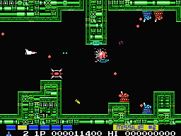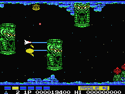 There’s a slightly heavier emphasis on story here, with a handful of cutscenes. The game takes place in the year 6666, starring pilot James Burton as he sets off to destroy the Bacterian forces let by Dr. Venom, an evil green faced alien. The Vic Viper is also ditched in favor of a new star fighter called the Metalion.