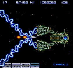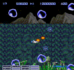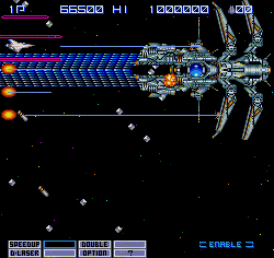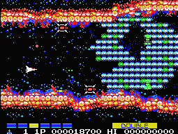 Many of the Gradius mainstays are first introduced here. Although there’s no Moai stage, there is a ruins level, a plant level, a biological level (which actually looks like you’re flying through intestines), and a fire level. There are numerous bosses, though they tend to repeat on a couple of occasions. When you kill one, you’re given the opportunity to fly into the core and enter the interior of the ship for a brief “extra stage”. If you complete it – and you killed the boss quickly enough – you’ll be rewarded with an extra weapon or two. If you get destroyed or were too slow, you get nothing.