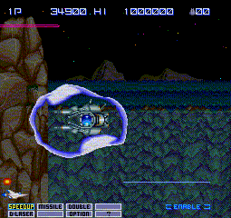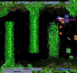 Some enemies also drop additional power-ups with various effects, including Enemy Slow, which briefly slows down time; the Option Ring, which will temporarily cause your Options to rotate around you; the Vector Laser, which shoots out a power wall of energy; and the Rotary Drill, allowing you to dig through certain walls.
