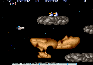 Several enemies were removed, including the sand lions in the first stage, the floating Moai head right before the boss of the Moai stage, a gigantic fire dragon before the boss of the fire stage (different from the worm-like creature that ends up being the final boss), and others are gone. Half of the underground portion of stage 3 is absent, as well as the 3D bonus stage. The eighth stage, the one with the little crystal blocks that assemble the stage as you fly through it, is gone entirely. The sixth stage, the biological level, has been truncated and moved to the end of the game, right before the final boss – the original boss of that stage, a series of brains similar to the Life Force Golem boss, has been ditched. The speed-up zone, which used to be a quick area right after beating the final boss, has been moved up a few stages, is now significantly longer, and includes a new boss.
