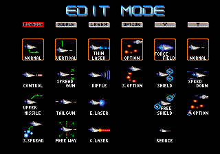 Some of the weapons in Edit Mode have changed too – the Control Missile and Upper Missile have been replaced with the Hawk Wing and 2Way Back, and the Spread Gun and Free Way are gone. There are two new Option formations – F. Option, which positions all of your Options in a vertical line for an even larger range of fire, and R. Option, which will cause the Options to rotate around the Vic Viper. The Free Shield has been replaced with the R. Shield, which also rotates around the ship. The Reduce shield now lets you take a couple of hits before you expand to the original size. There’s also an additional ability in the ! column – the Mega Crush, which kills everything on screen.