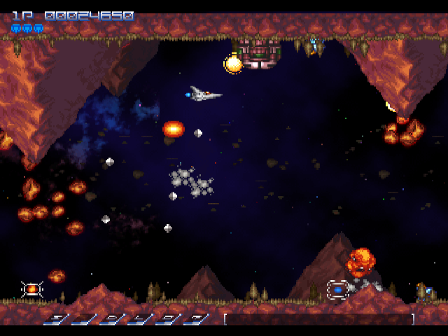 Nearly all of the music is taken from the MSX games, rearranged to use the same instrumentation as Gradius II and III. A few other songs are taken from the Famicom version of Gradius II, and even the second Game Boy game. All of the music is composed by Manabu Namiki, the composer of many Cave games and essential go-to guy for old school-style shooter music. Although there are only three weapon configurations in the beginning, you can unlock more as you beat the game, including the return of long forgotten weapons like the Up Laser. A free DLC patch also tweaked some levels and added some extra music.