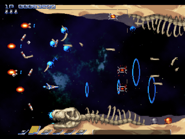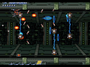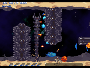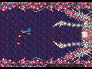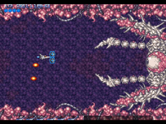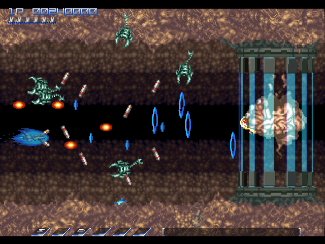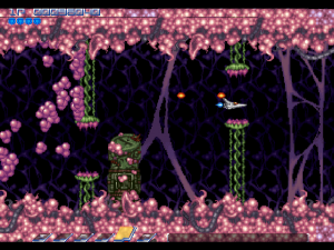 There are a few clever areas too, particularly the area before the second level boss. You need to shoot your way through some vines, but at the same time, you’re chased by little pink blobs. If you weave through the vines properly, they’ll get stuck, protecting you from harm. The kicker is, each one of these blobs will give you a power orb – and you’re being chased by over a dozen of them. If you’re fast enough to dive through the vines, wait until they catch the orbs, then double back to destroy them, you can get yourself powered up in no time.