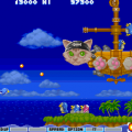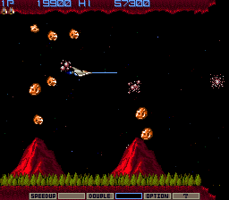 The MSX version suffers from the same issue as all of the other shooters for the system – the sprites move smoothly, but the scrolling is incredibly choppy, which makes it hard to judge the speed of projectiles. It makes the game harder than it really is, and can be quite headache inducing. It also suffers from the same restrictions as the NES version – miniaturized bosses, limited Options, and no vertical scrolling. It also adds an extra level, which takes place in a graveyard, plus two hidden bonus levels, which have an exclusive music track.