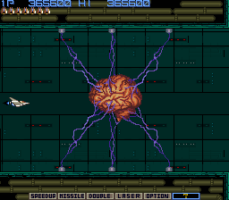 Each level in Gradius usually consists of three segments. The first is the “air battle” segment, which consists of an outer space background and a number of simple enemies. These are meant to allow the player to gain power-ups between levels. The second segment is the actual stage. Each level in Gradius has some kind of theme to it – a cave level, a fire level, a plant level, a biological level, and so on. The final segment is the boss. After defeating it, the stage will fade into the background, and the navigation segment for the next level starts. The Vic Viper can only take a single hit before being destroyed, which will send you back to an earlier checkpoint.