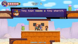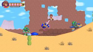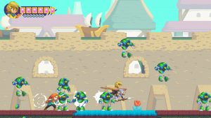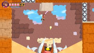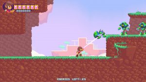 Every single attack takes off exactly one hit and no more. Gimmicks and boss attack patterns are easy to learn even if some may take a few tries. Falling in pits carries a minimal penalty in the few levels that contain pits. The missions requiring you to fight all the enemies show an arrow onscreen pointing to the nearest enemy so you don’t waste time getting lost. Missions requiring you to collect objects often contain more objects than you need, in case you find some of them too difficult to get. Even the mission where players are required to collect tokens within a time limit carries a minimal penalty for missing the time limit – a random, weak enemy spawns somewhere, and the token counter decreases anyway. Another level features a time limit with an instant death penalty for failing, but the limit itself is very generous.