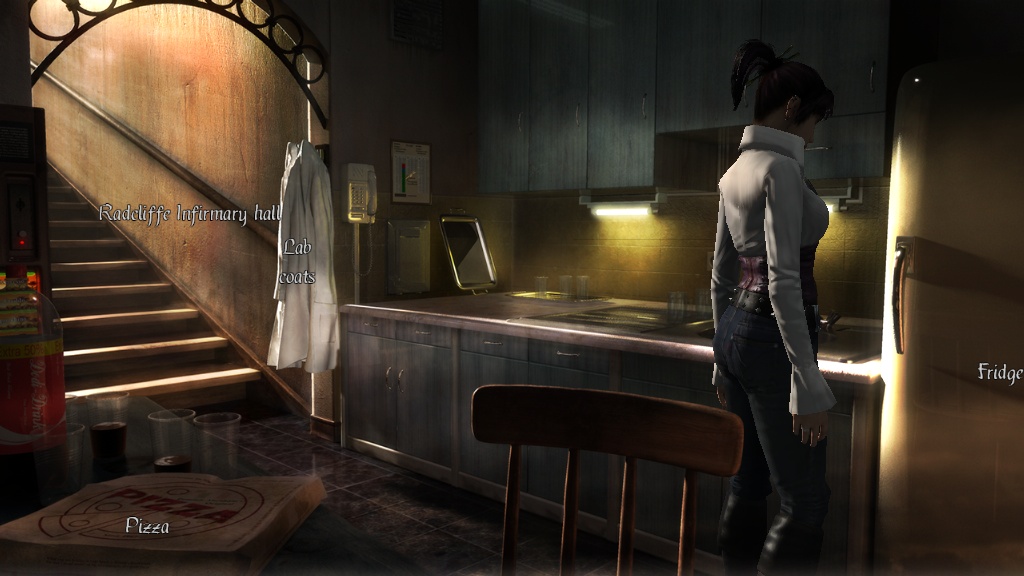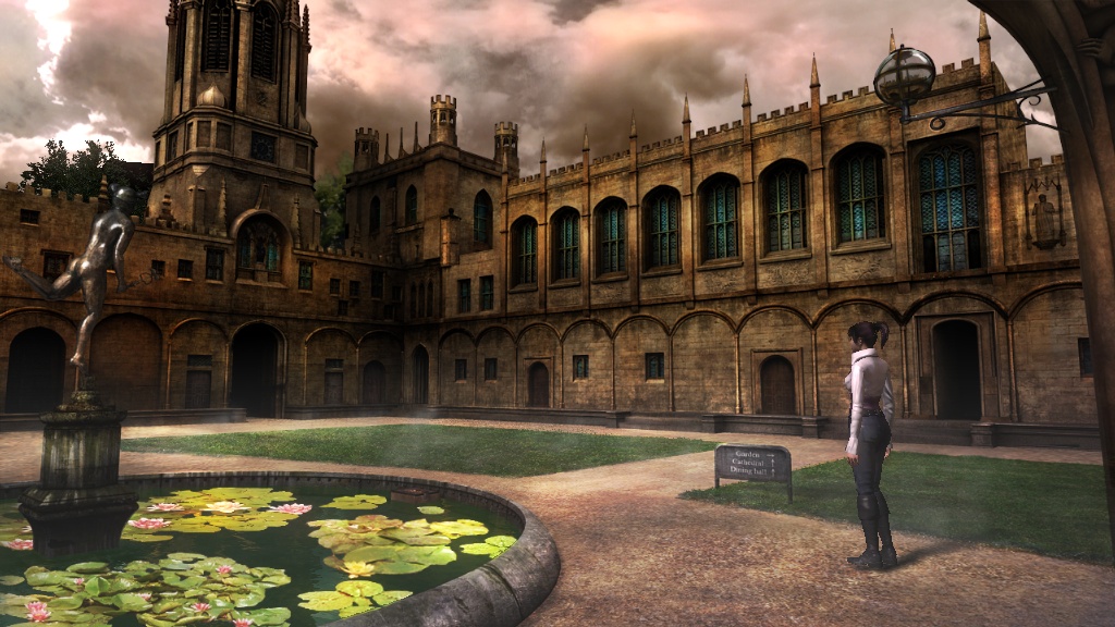 Polygonal characters in front of mostly static bitmap backgrounds have become kind of a standard for the adventure genre, and Gray Matter makes no exception here. Elaborate lighting techniques do a great job to set the mood and create a rather convincing illusion that both layers belong to the same world; only on a few screens does it become visible that the characters are hovering in front of a flat plane. Despite the whole game taking place in and around Oxford, Sam and David visit many locations with very different scenery and atmosphere. Some bathe in grandeur like the stunning view in Headley’s office or the top of Carfax Tower, while others feel deserted and claustrophobic. In the endgame it gets all crazy and surreal, too. The game also conveys a strong sense of authenticity. One can hold photographs next to the more famous locations in Oxford and try to spot the differences.