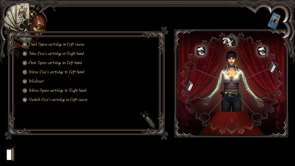 Sam’s method of winning the hearts of her acquaintances is magic tricks brought from her “profession” as a street magician. These account for a good portion of the puzzles and are supposed to be Gray Matter’s big new thing. When it’s time to “trick” a person, the talking icon switches to a magic hat. Sam then has to select the appropriate trick out of a dozen from her spell book, and apply it to the given situation by using commands to “palm” items in her hand, “vanish” them up her sleeve and so on.