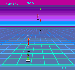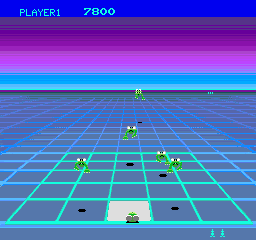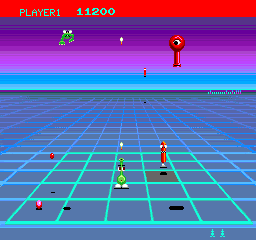 Gridlee is the name of the protagonist, a slim bottle-shaped green fellow with an opening in his head from which he is able to fire bullets. He is named thus as he lives on a grid, five-by-five squares set within a much larger grid that pans out into the horizon. Gridlee must defend his territory from invasive enemies who bounce around his grid and try to zap him. The normal enemies are Yumperz, crazy cylindrical beings that look like missiles attacked to pogo springs. They usually hop around one square at a time, but later levels make their patterns more erratic as they bound to squares on the entire other side of the grid. Starting at level 3, you are also introduced to the Fergies, resembling frogs with large eyes and two big legs, and they are even more erratic and unpredictable than Yumpers. Neither enemy actually squishes you directly, but they instead attempt to defeat you by electrifying the squares on which they bounce. Step on a glowing white tile and that’s the end of you, but zapping all enemies with your head bullets wins the level. You’ll have to watch out for when a worm quickly slinks across the stage, as they instantly light up any tiles they pass through and cannot be stopped. Stage 4 even gives you a particularly special foe named Igor, who can’t actually kill you but instead floats by and spits magenta goo onto a square. This stays on even after you lose a life, and it’ll cause you to slow down massively if you try to tread on it.