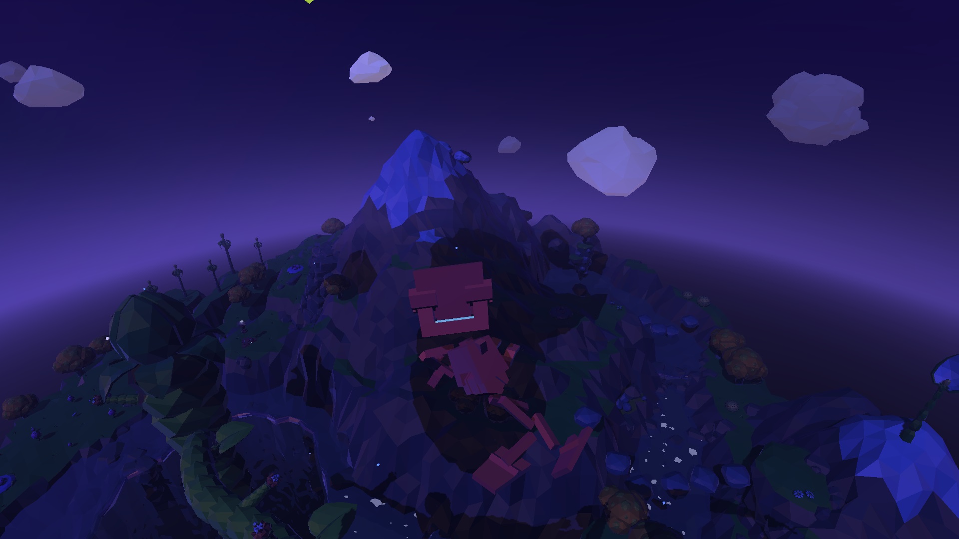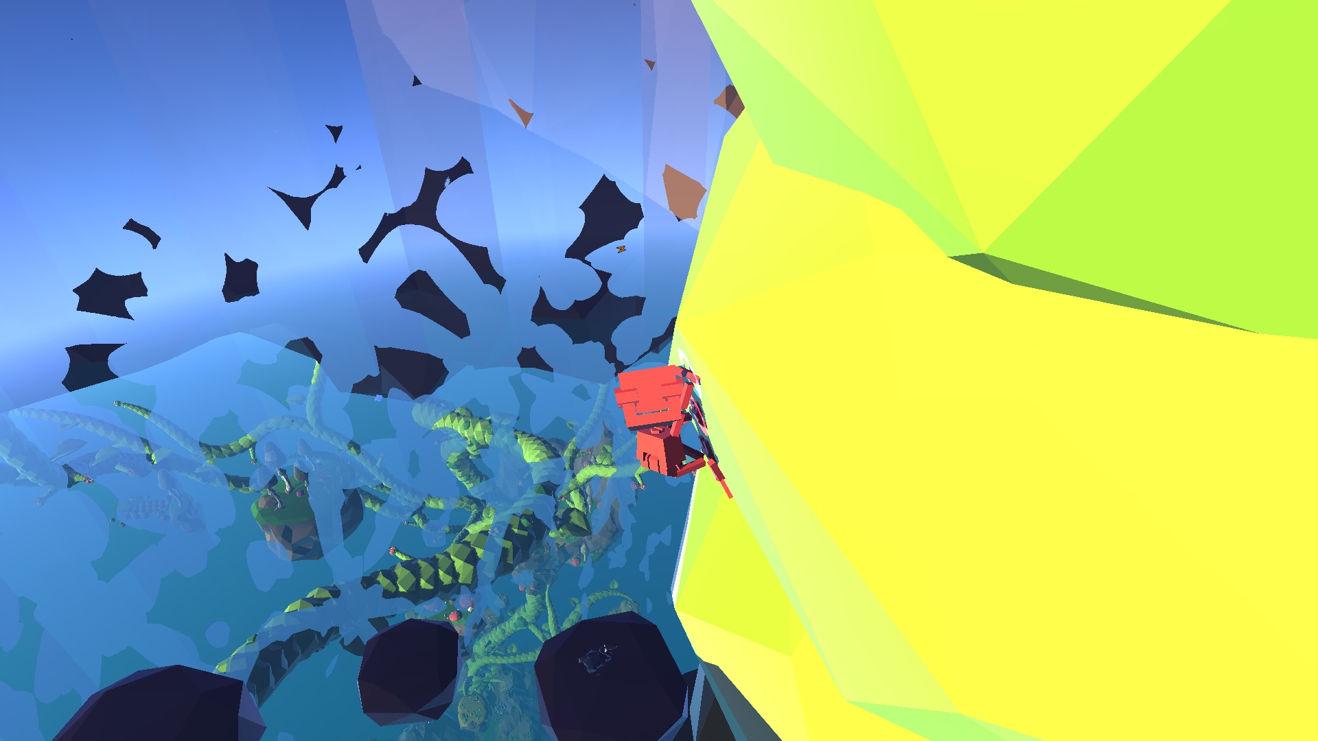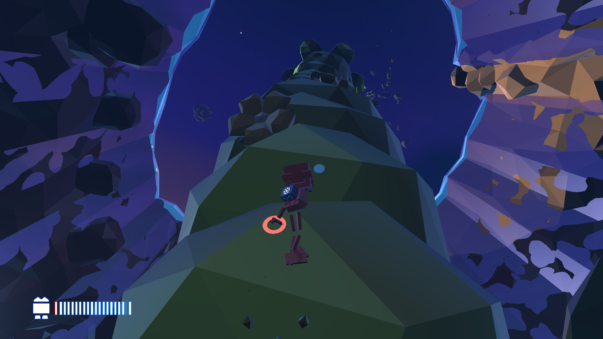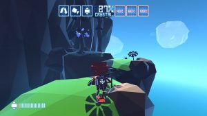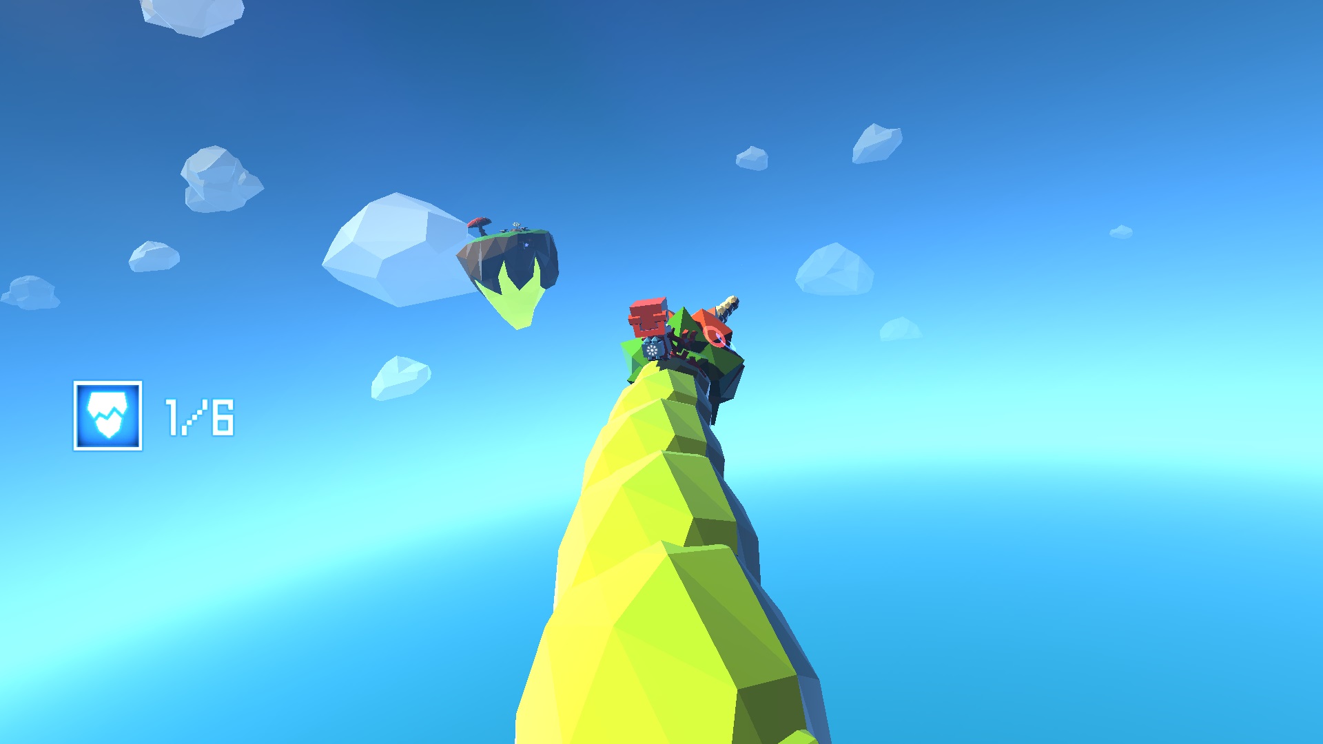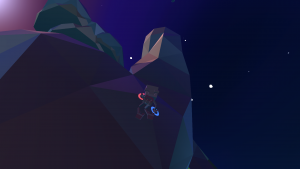 The game uses primary colours to make important objects stand out from the rest of the world (B.U.D. and the teleporters are red, the crystals are bright blue, and the floating islands with energy are a practically neon green), while the constant day/night cycle is emphasized with lighting that contrasts very bright colours and strong shadows to create a gorgeous looking world.