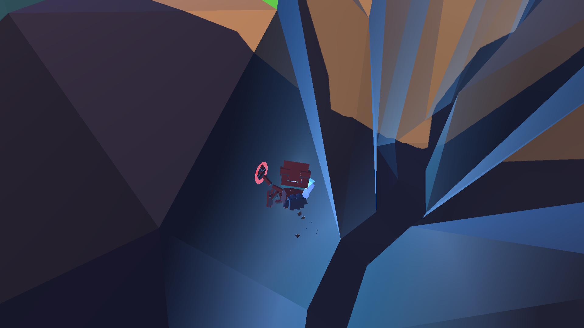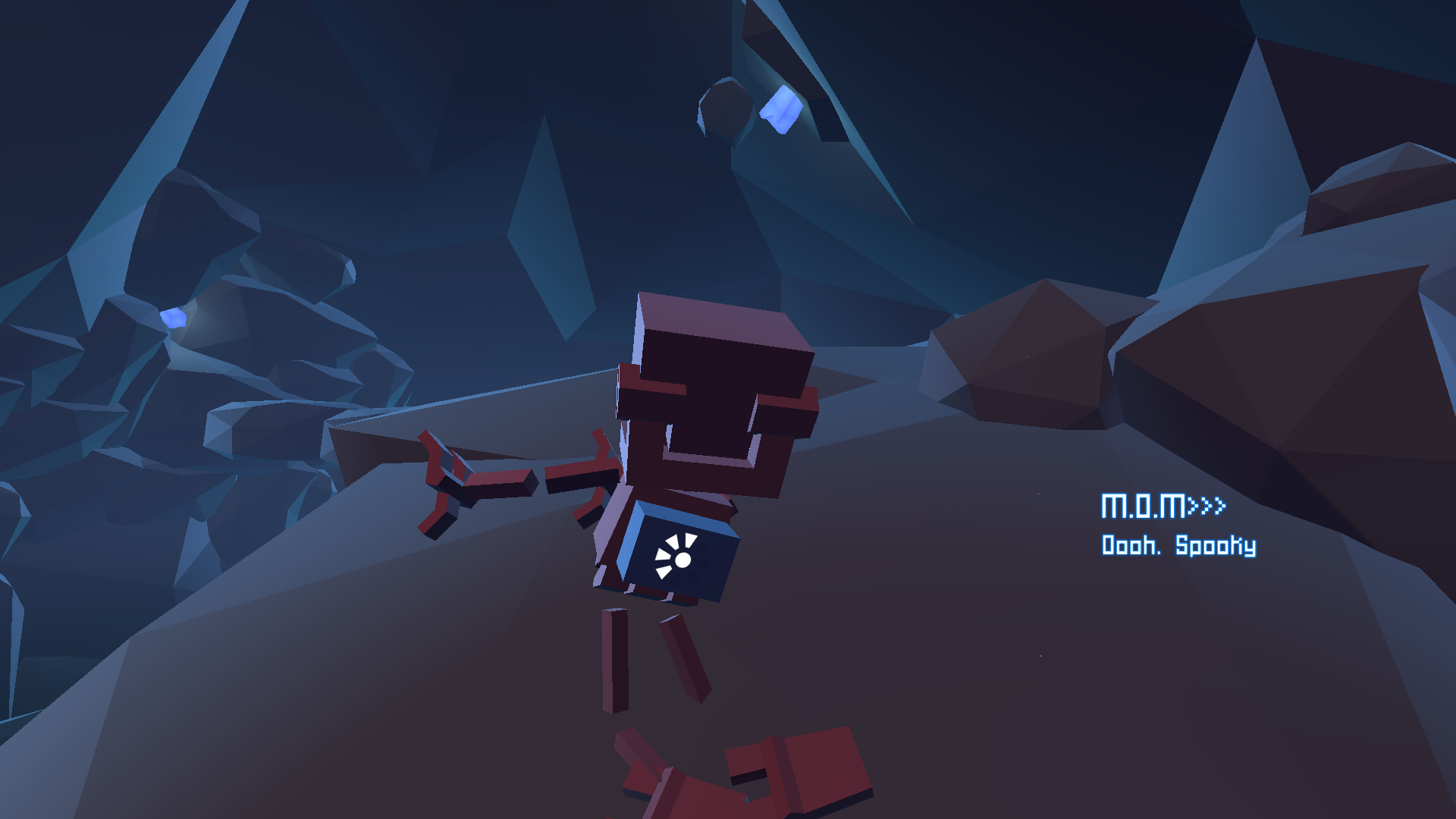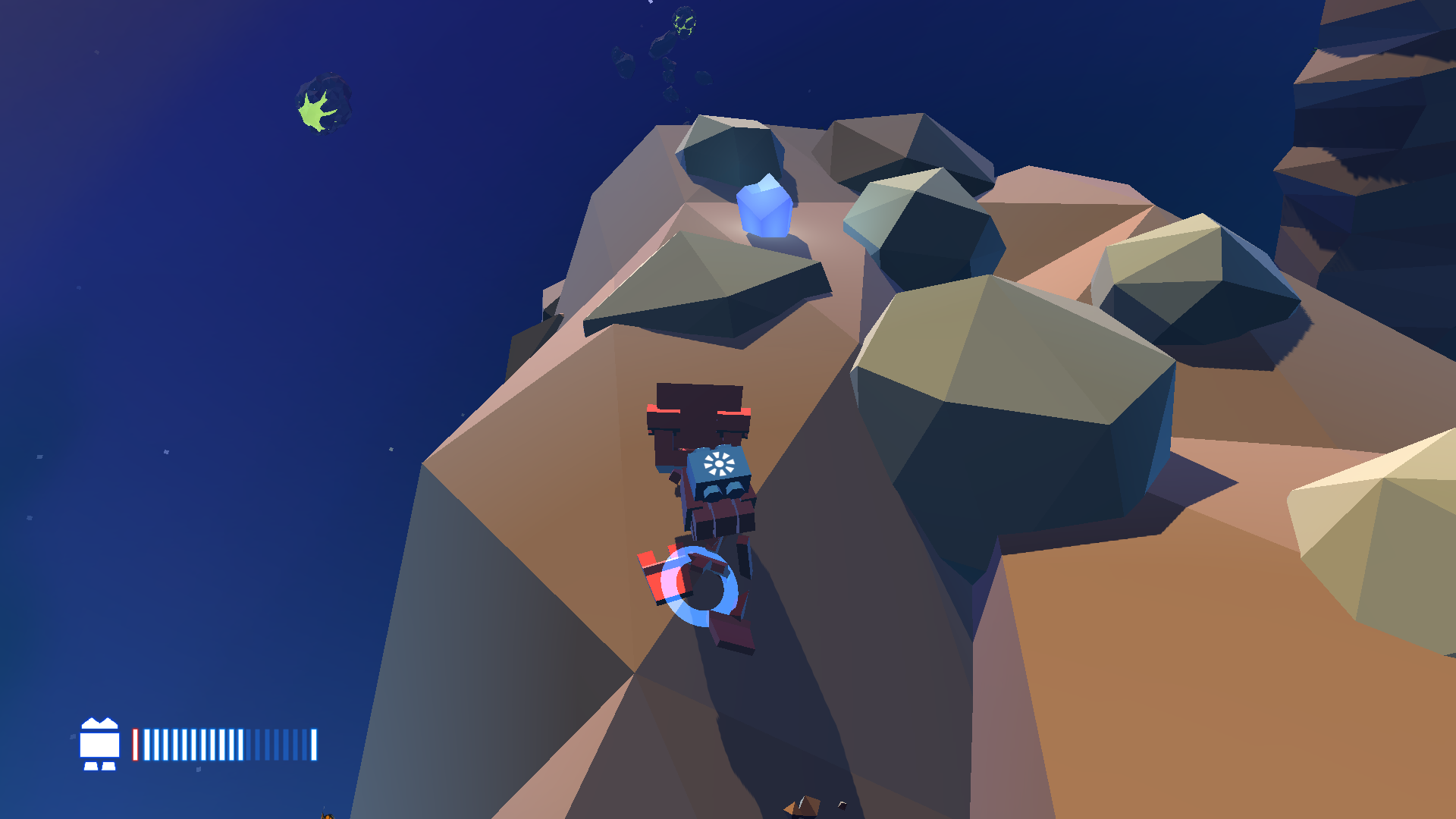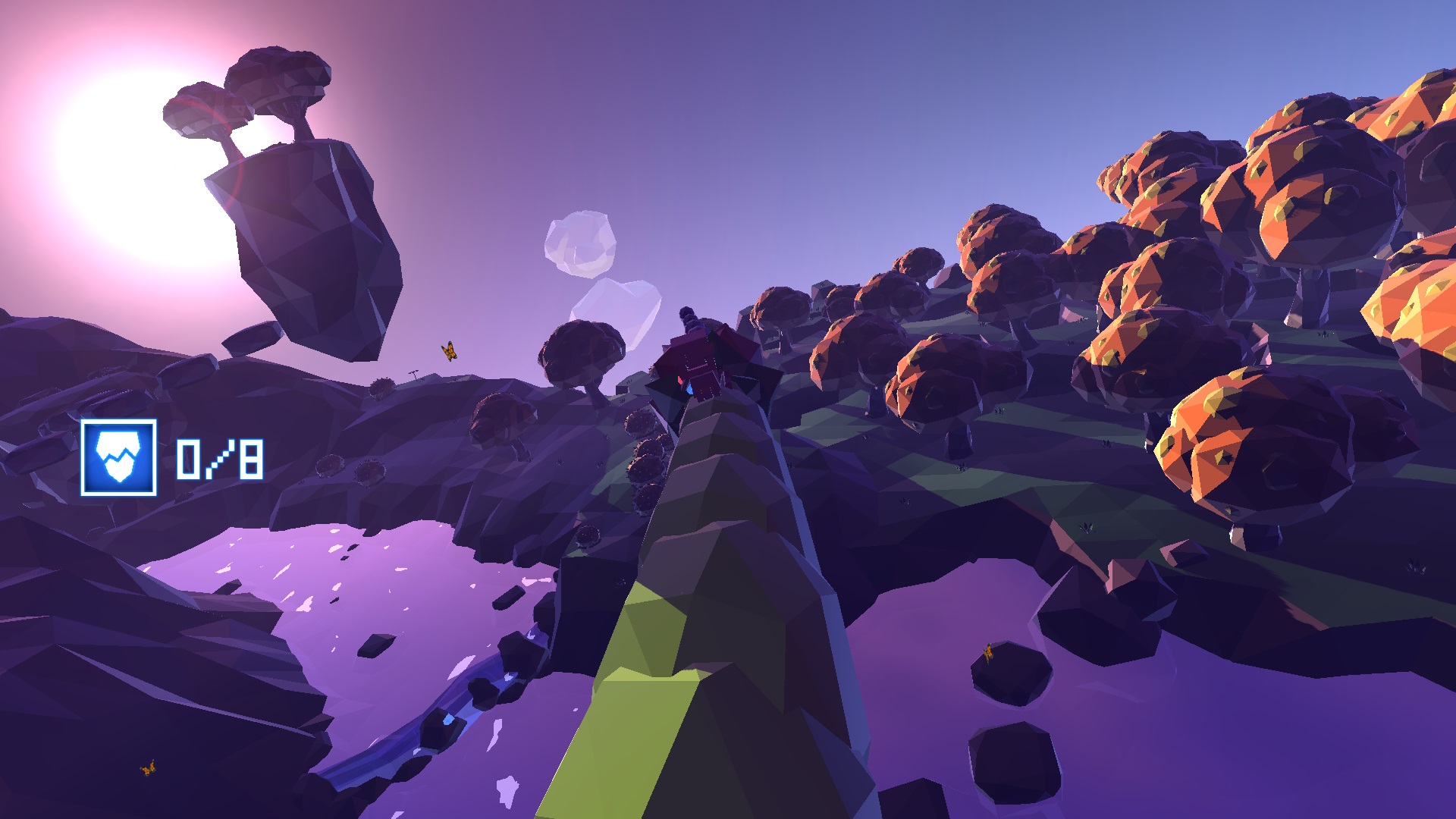 The game uses primary colours to make important objects stand out from the rest of the world (B.U.D. and the teleporters are red, the crystals are bright blue, and the floating islands with energy are a practically neon green), while the constant day/night cycle is emphasized with lighting that contrasts very bright colours and strong shadows to create a gorgeous looking world.