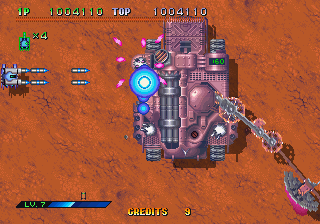 That said, the special effect of the day in Guardian Force definitely is hardware rotation. The game is all about using the rotating turret to one’s advantage, and bosses either track the player down in 360 degrees or feature all sorts of scything appendages to cut off a retreat. Guardian Force really has to be commended for putting its rotation hook to good use. It’s rare that you’re allowed to cruise forward for any length of time as in a normal shoot-em-up – enemies spawn from all directions or turn and give chase from behind once passed, and there’s always enough bullets on screen to keep you moving. Bosses especially encourage drastic action in order to avoid their heavier barrages and exploit their weak points. If there’s any fault to be found with the multi-directional fire system, it’s that it can be really easy to end up between an impassable object and the edge of the screen. Dying as a result of getting crushed by the scrolling is always frustrating and can happen more often than you’d think when pinwheeling around mid-bosses, trying to stay alive. Losing a grade of weapon power upon death can also be a big downer, since many enemies soak up bullets and bosses can take some time to wear down without using special weapons.