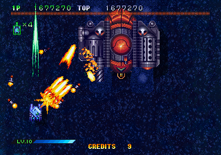 There’s more to a shmup than mechanics, though, and many less serious enthusiasts of the genre couldn’t care less about scoring systems. They will be happy to know that Guardian Force has solid aesthetics and a flavor all its own, as any gameplay clip or screenshot will show. One of the most notable things is that – like most games that originated on the ST-V – Guardian Force is laid out for the aspect ratio of home televisions. No need for tate mode or magnifying glasses here. Think Soukyuugurentai or Radiant Silvergun. The graphics are deeply shadowed and generally dark, with hints of Battle Garegga in the attention to details. It feels almost as if the entire game takes place at night, but bullets and enemies are still easy to distinguish from the backgrounds. Explosions are satisfying and have plenty of pop. The selection of enemies avoids comparisons to the classic Raiden by mixing things up quite a bit. There are the usual tanks and flyers, of course, but also massive gunning platforms, hovercraft, and orb-like ships covered in transforming goo. Success managed to ladle in some nice details – enemy soldiers keep running after they’ve been hit, clothes on fire. Floating ships drift to the ground in ruin, and chain guns kick out piles of house-sized shells. Other neat effects like flamethrowers and glowing axes are just the icing on the cake. There’s scaling throughout as powerups bounce up and down all over the place.
