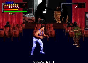 The digitized sprites of the actors is rather grainy. The scaling is pretty good though, as sprites grow and shrink when at appropriate places on the screen. Things get a lot less grainy when characters are in the center row. Every so often you also come across some interactive sight gags that are amusing and may distract you from the awful controls and sound. Some of the more interesting ones are the ability to pick up and throw a homeless man as though he were an inanimate object, punching a granny only to have her punch you back, and a creepy man in a trench coat flashing a subway.