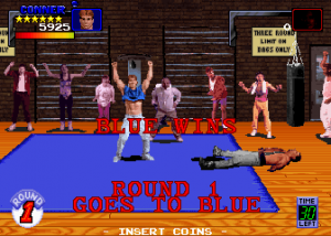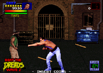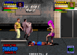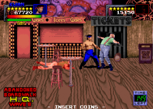 The story involves Mr. Big (no relation to similarly named characters from SNK’s Art of Fighting or Midway’s NARC) taking over “this crummy town”. It’s up to four gym rats to take justice into their own hands and stop him. Mr. Big commands three gangs: The Dreads, Shavers, and Dragons. The Dreads are all Jamaican stereotypes with dreadlocks. Their leader is the ridiculously named Jay-Jay, who becomes playable once you beat him. The Shavers are bikers/skinheads that look utterly ridiculous. Their leader is Boris, a disappointingly generic guy who joins once you defeat him. The Dragons are the last gang. They’re Asian stereotypes and, as expected, their gang leader Kwan becomes playable after defeat. After conquering the three gangs it’s off to fight Mr. Big, who recycles previously fought enemies from other stages.