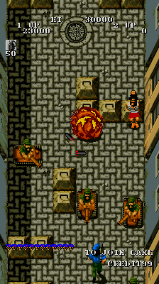 Setting aside all of its touchy history, Guerrilla War itself is quite a fun game. It starts with a picture of Che and the amusing caption, “Hail the heros [sic] of the revolution!” After Che and/or Fidel ride their boat to a beachfront narrowly avoiding bomber planes, they begin their fight to overthrow a dictator which may or may not be Batista. The gameplay is incredibly akin to Ikari Warriors, so much that it may as well be considered part of the series even if only in spirit. You have a rotating joystick which allows you to walk and turn with both actions independent of each other, an effect sadly lost on modern emulators which attempt to compromise by setting the rotating effect to two keys, which is certainly not quite the game. One button fires off your rifle while the other tosses grenades; grenades are limited to fifty per life (which is still a lot), but unlike IW, rifle ammo is conveniently unlimited. It’s still wise to mind your shots, as you run the risk of hitting prisoners of war, cruelly tied up and stuck on the battlefront by the enemy regime. You get 1000 points if you run in and rescue them, but 500 points are deducted for each victim you accidentally shoot.
