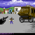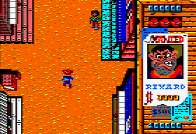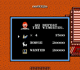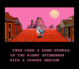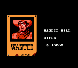The music, composed by Junko Tamiya (Strider, Sweet Home, Little Nemo), is catchy and better than the Arcade version, with the best tracks being “Town of Hicksville”, “Bandit Bill”, “Stage clear”, “Death Mountain”, “Cheyenne River”, and “Fort Wingate”. The “Cheyenne River” theme is kinda reminiscent of the theme song to the old TV show CHiPs. The music can get a bit repetitive, though, if you don’t have the wanted poster and end up looping the level over and over again.
