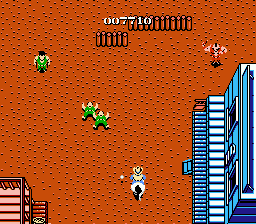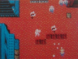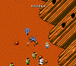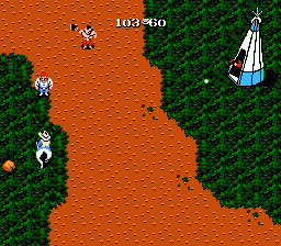 Not only is the storyline different, but so is the gameplay. There are now only six levels: Town of Hicksville, The Boulders, Comanchi Village, Death Mountain (not to be confused with Zelda’s Death Mountain), Cheyenne River, and Fort Wingate. In each level, not only will you have to fight off the common enemies, but you’ll need to obtain the wanted poster. If you don’t have it, the level will go on forever. Like before, you can also pick up money bags to raise your score, and collect boots and rifles to improve your shooting and speed. The POW symbol that will kill all enemies on screen and the dreaded cattle skull also return in this version. Finally, there are two different yashichi symbols this time around: The white-on-red ones that give you an extra life, and the white-on-blue ones that give you temporary invisibility. Left dying in the desert are the special button combinations, just like in any other of the home ports, due to the limitation of two action buttons.