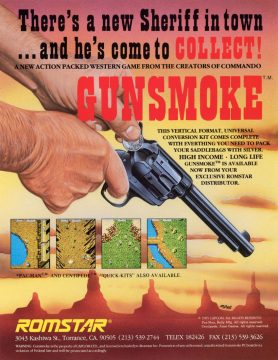 In 1990 the Korean company Prosoft produced an unauthorized port of Gun.Smoke for the MSX compatible Zemmix console. It appears to be derived from the NES version, but unfortunately isn’t preserved and ultra rare like most Korean 8-bit games, so hardly anything is known about it, otherwise.