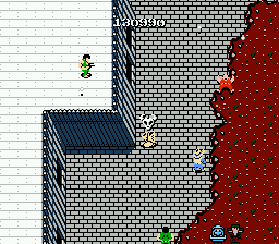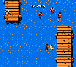Gun.Smoke on the NES is a much better and less-frustrating game than its Arcade counterpart. There’s more to do, and the levels are also a bit more interesting this time around. The first level is set in the alleyways, the second level is set in a deserted valley, the third level is set in a Native Indian village, and the fourth level takes place below the mountain side, where you’ll have to watch out for the rolling boulders. Unlike in the Arcade version, where you only fought one Ninja, in this version, you’ll also have to fight regular Ninjas as well. The only thing that would have made both versions even more awesome was fighting robots in the old west. But Ninjas are still awesome. The fifth level takes place in a forest. You can also slosh through the water, where enemies will also appear, by foot or on he horse. And finally, in the sixth level, which is set in a white fortress, try your best to stay alive, because the bullets blend in perfectly with the white floor.
