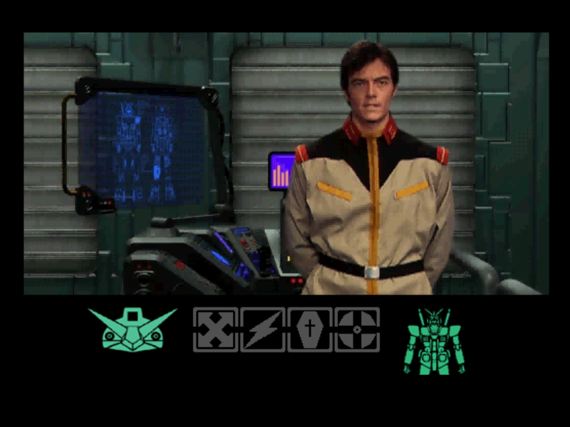 As for the FMV itself, the backgrounds and mecha are computer rendered, while the characters are real-life actors, both a stark contrast from typical hand drawn Gundam anime. The CG is excellent for the mid-1990s, but the live action stuff is hilariously bad, doubly so if you’re familiar with the original anime. The most egregious is Char, one of the most famous antagonists in anime history, who’s reduced here to a middle-aged community theater actor in a bad Halloween costume. The funniest scene is one where he grabs your mecha while they’re flipped, and the FMV cut-in footage is also upside down. But there’s no gravity in space so their orientation shouldn’t even matter, not to mention that it looks incredibly silly!